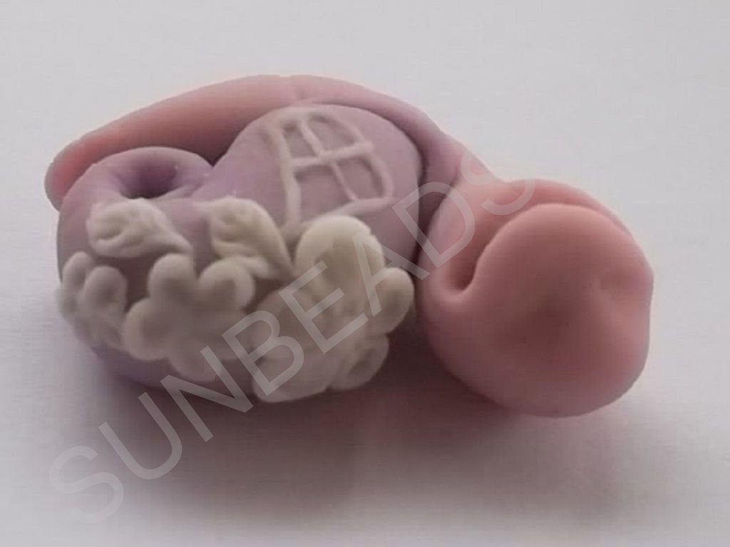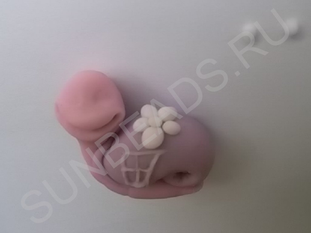 - Все той же шпажкой или зубочисткой делаем рельефы. Продавливаем складочки на животике, закругляем края прикрепления ракушки и делаем завитки более выраженными.