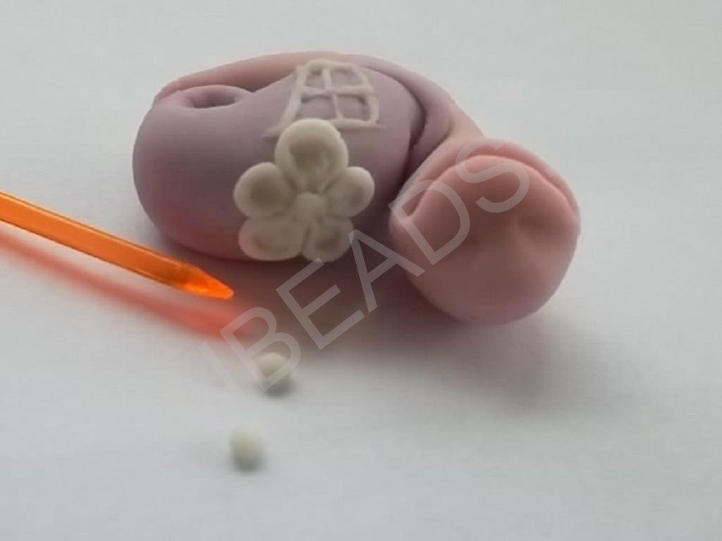 - Когда все основные детали вылеплены, приступаем к их декорированию. Катаем из пластики тоненькие жгутики и делаем на домике-ракушке окошко.