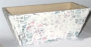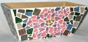 Для изготовления ящика для цветов, украшенного мозаикой потребуется: мозаика разных оттенков (я применила размер 15×15 мм); мозаичный клей; раствор для затирания швов; пинцет; лак.