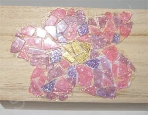 Приклеим на мозаичный клей осколки мозаики на рисунок. Вокруг цветка также наклеим мозаику, но уже других оттенков.