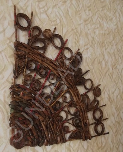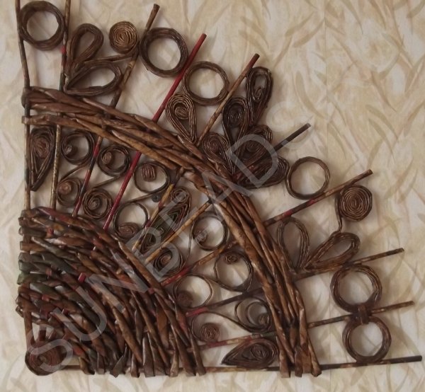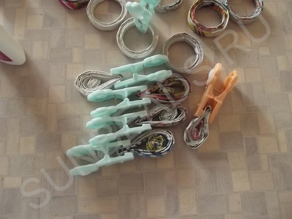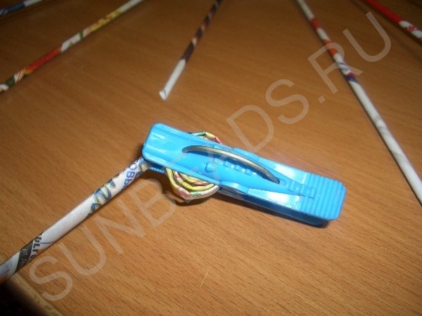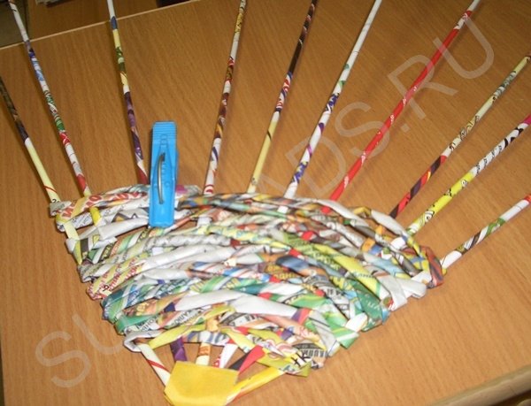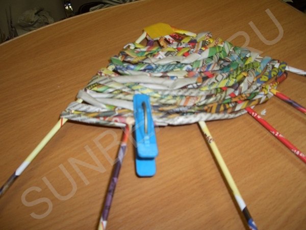 Продолжается плетение до девяти рядов, после чего кончики рабочих прутьев обрываются и закрепляются с помощью клея ПВА и прищепки.
