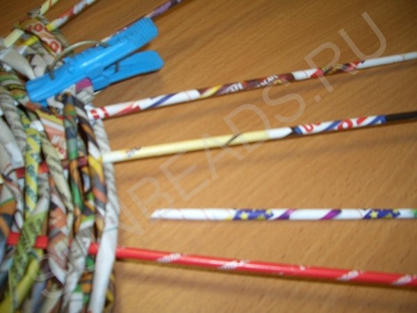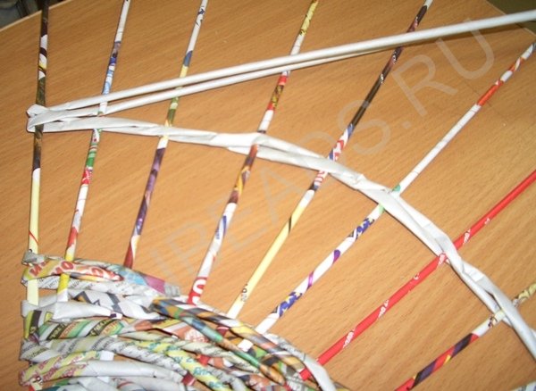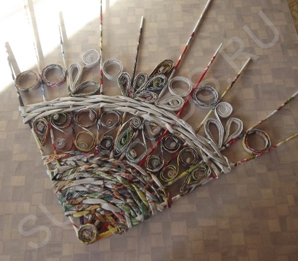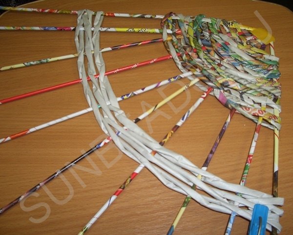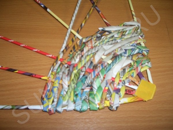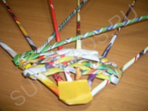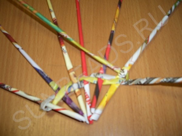 Для начала плетения 6 журнальных трубочек раскладываются веером, скрепляются простым плетением в один ряд мягкой газетной лозой, далее приклеиваются в центре двусторонним скотчем.