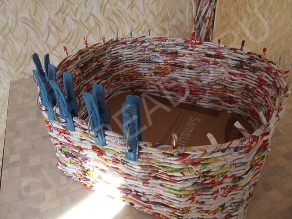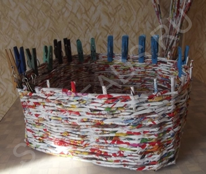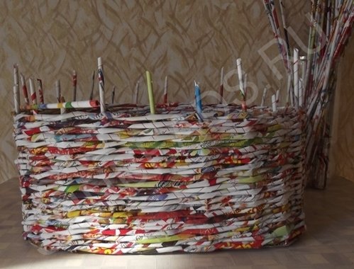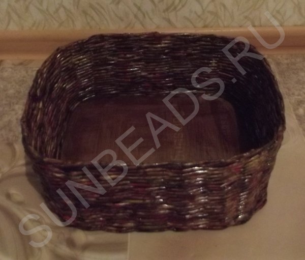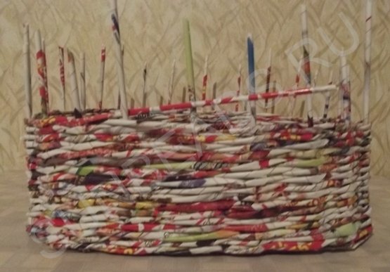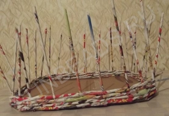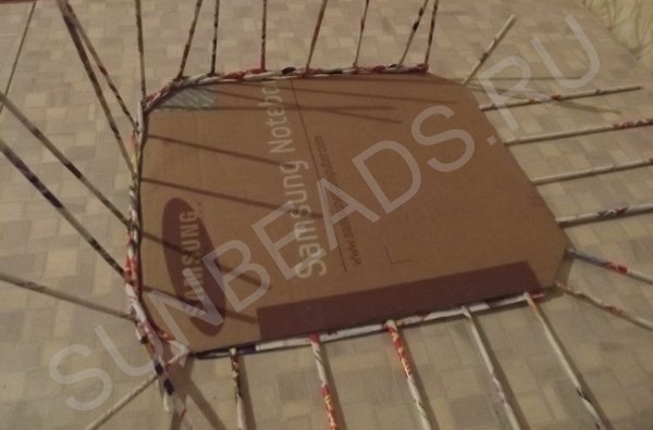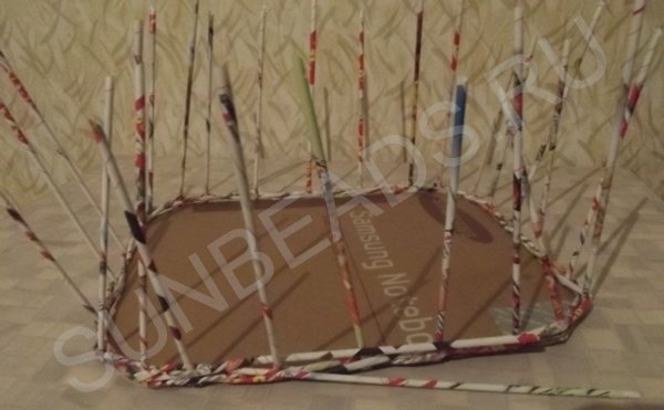 Все приклеенные трубочки стойки сгибаются и поднимаются вертикально, берется рабочая нить, сгибается вдвое и заплетается за поднятые стоечки простейшим переплетом. При плетении нужно следить, чтобы стойки стояли прямо, тогда и стенки получатся ровными. Плотным переплетом выполняются 22 ряда в высоту, после чего рабочие нити обрываются и склеиваются канцелярским клеем.