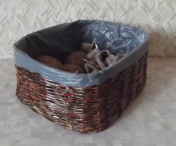 Готовое изделие покрывается лаком с пропиткой цвета палисандра. Затем у обычного пакета отрезаются ручки, основание помещается внутрь короба и натягивается на верхние бортики. В таком исполнении можно пользоваться коробом без боязни его испачкать.