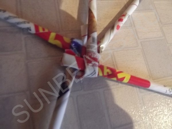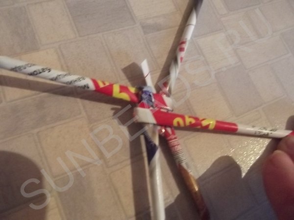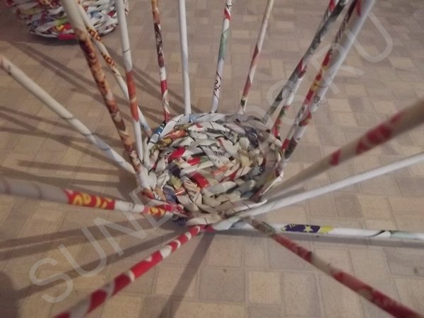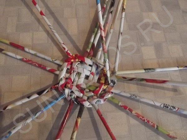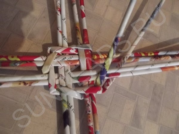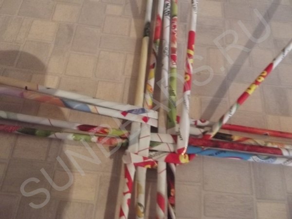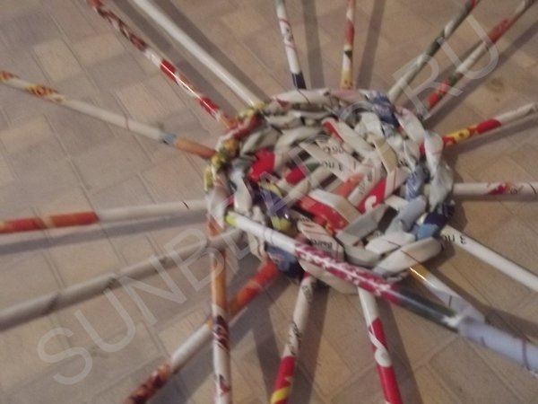 Для изготовления нижней детали яблока складывается решетка из четырех парных трубочек. Рабочую лозу складывают пополам и заплетают вокруг решетки, обнимая каждую пару с двух сторон. Проходя второй круг, пары расплетаются по одной, и образуется круглое дно. Теперь плетется еще три круговых ряда для увеличения донышка.