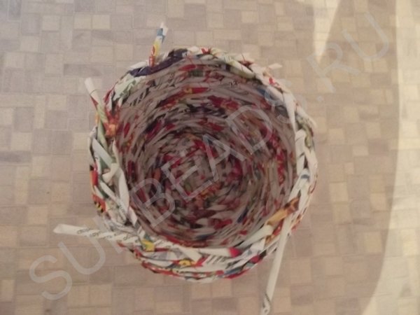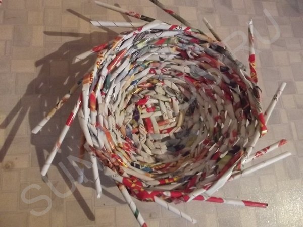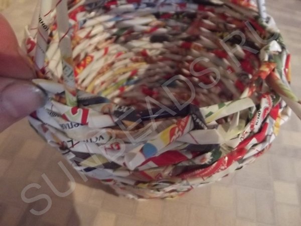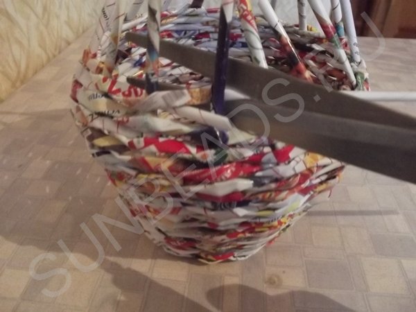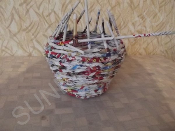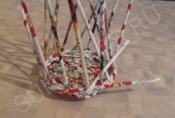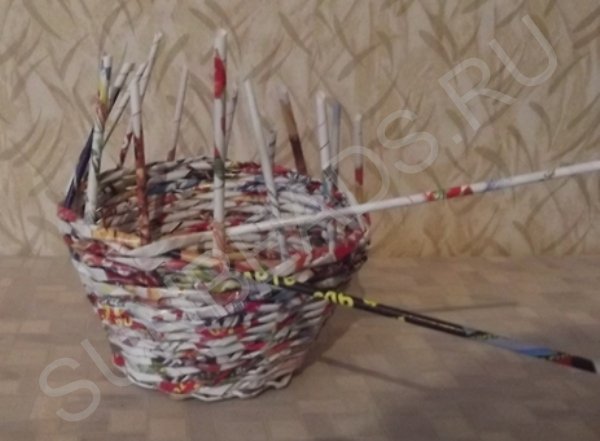 При переходе к плетению стенок, все прутики загибаются вверх и становятся стойками. При работе используется емкость в виде бочонка для формирования расширяющихся боков детали. Вверх выполняется 13 рядов, затем форма убирается, и стоечки загибаются внутрь, плетение сужается пятью рядами.