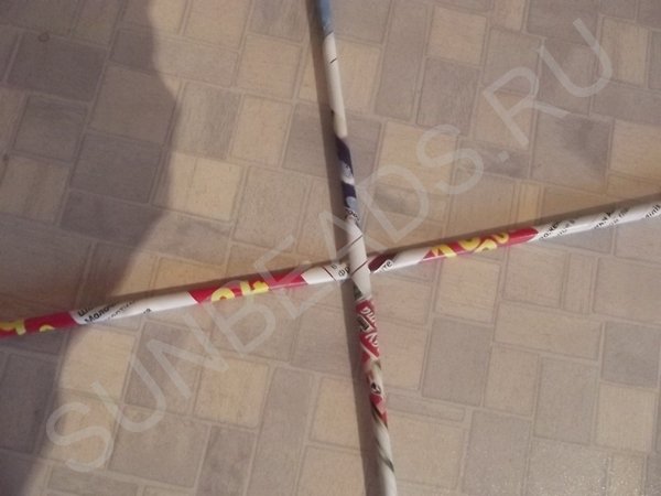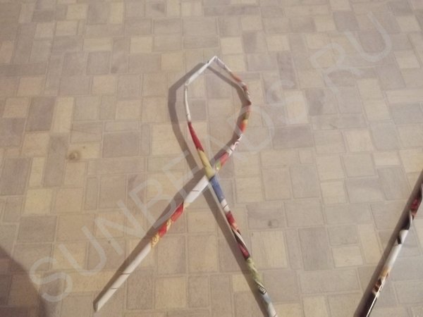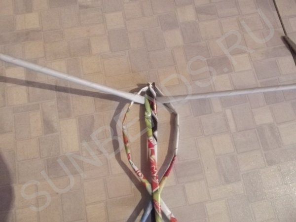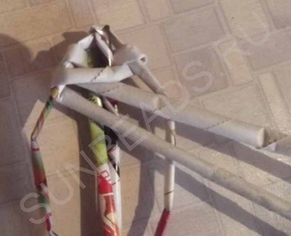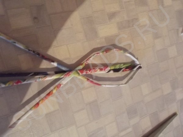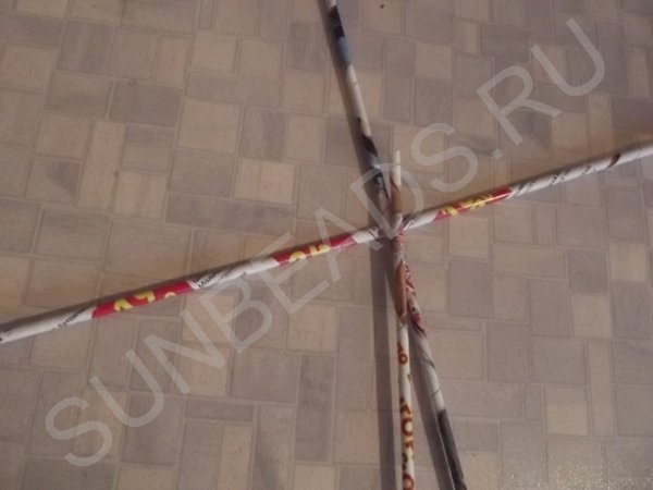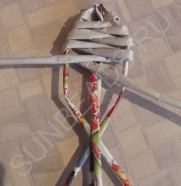 Плодоножка плетется спиральным плетением из двух перекрещенных палочек. К получившимся четырем концам добавляется рабочая нить, каждый конец поочередно заворачивается наверх и кладется на следующую палочку. Произведя нужное количество кругов, плетение заканчивается, но нити не обрываются, они потребуются для сборки изделия.
