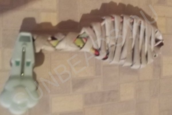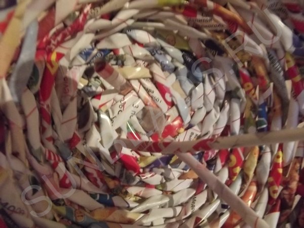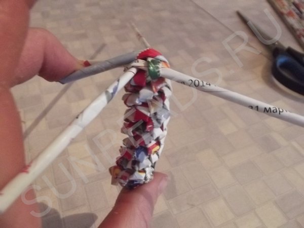 Далее плетется листочек, одна журнальная трубочка складывается в форме листика, вторая прокладывается по центру. Далее конструкция плетется мягкими трубочками из газеты. Это единственная деталь в изделии, выполненная газетной лозой, так как в данной операции трубочки много раз сминаются.