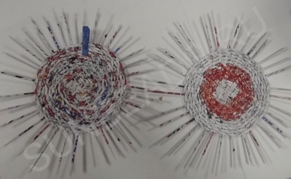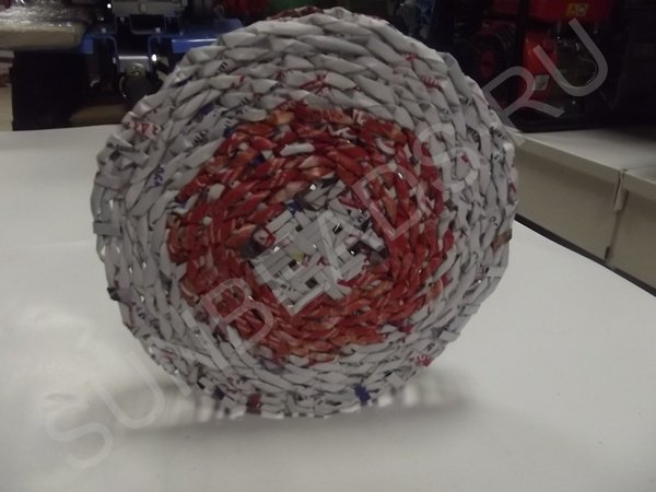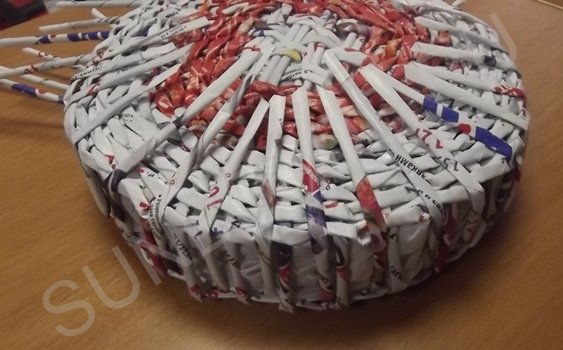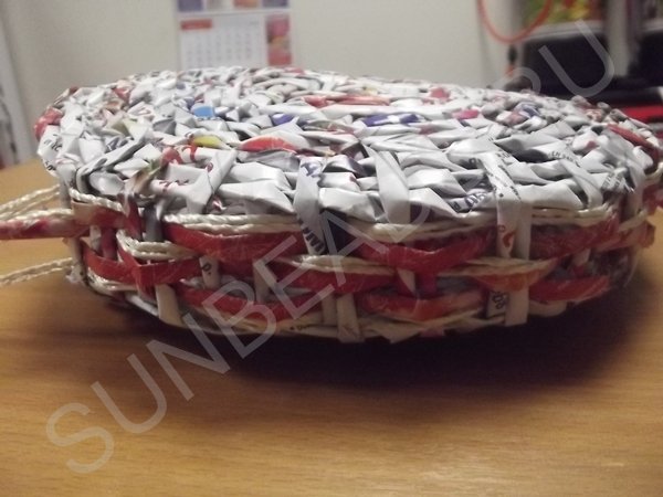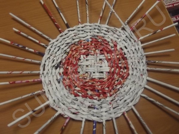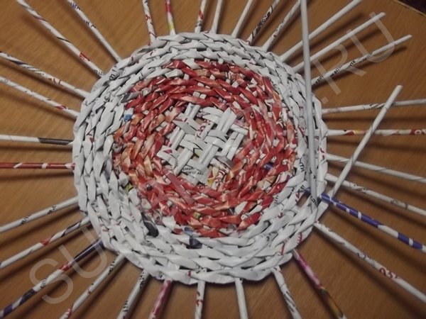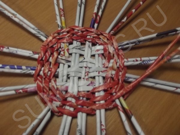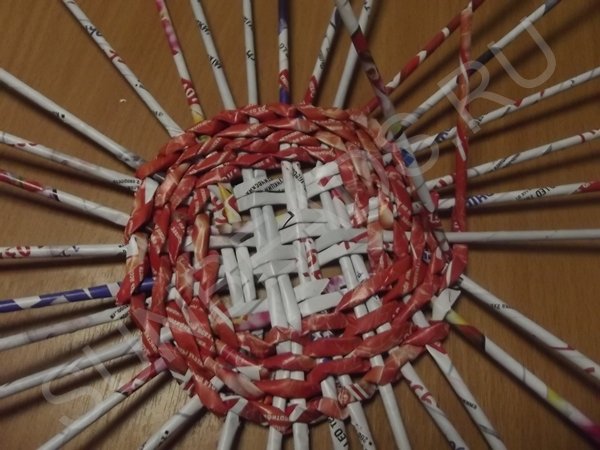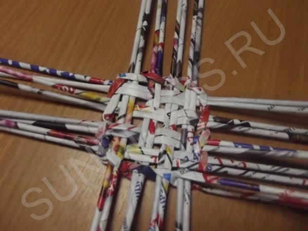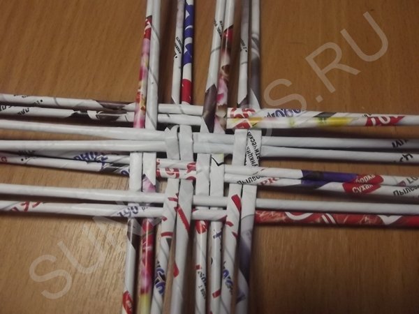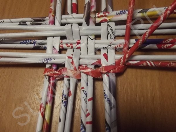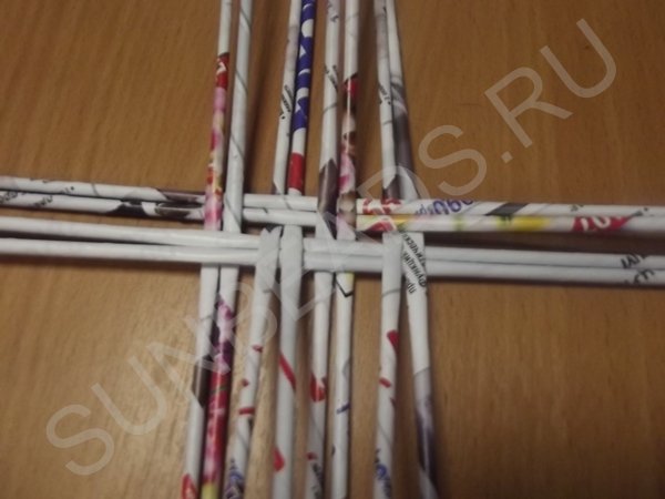 Журнальные трубочки раскладываются четырьмя парами по вертикали, берутся еще четыре пары трубочек и переплетаются с первыми по горизонтали. Создается ситцевое плетение в виде квадрата. Этот квадрат заплетается по кругу рабочей трубочкой, сложенной пополам.