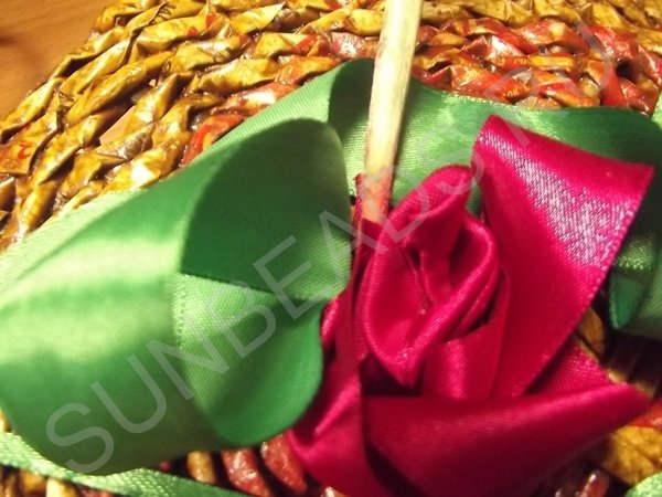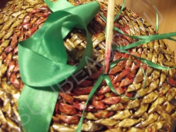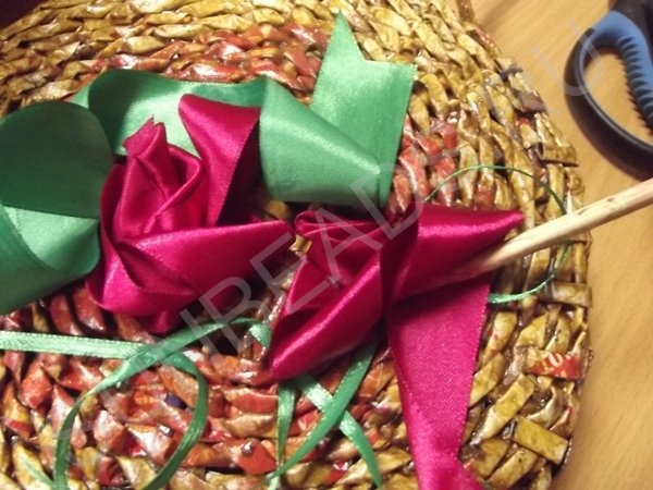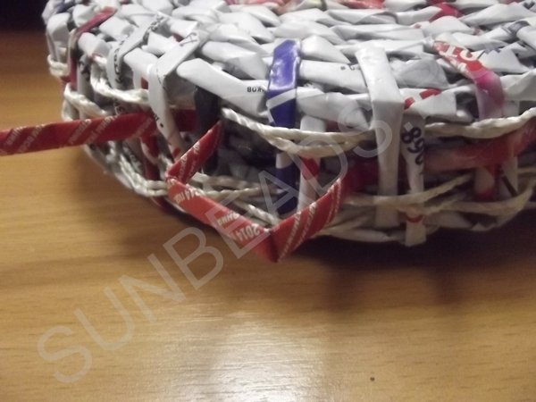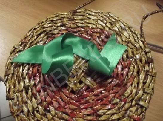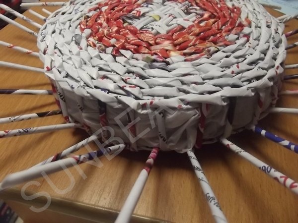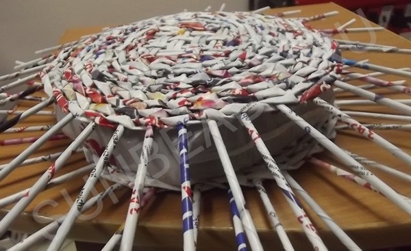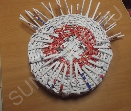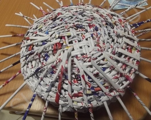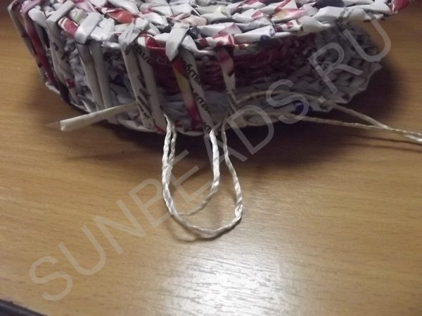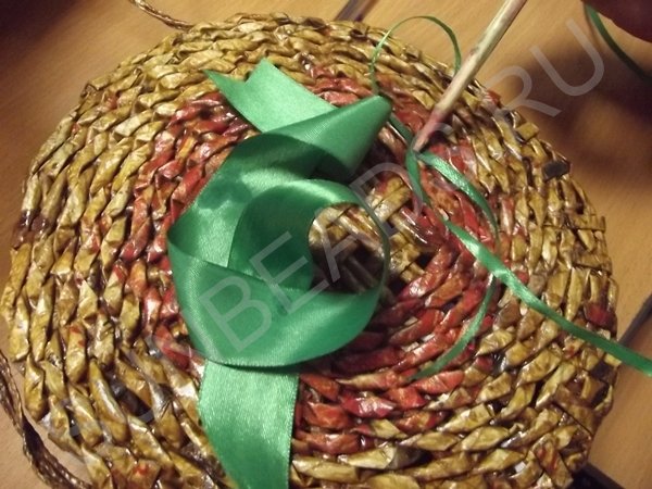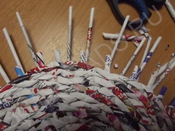 На третьем ряду плетения, центральные трубочки разводятся и плетутся по одной, превращаясь в стойки. Плотное плетение выполняется в 10 рядов, рабочие кончики обрезаются и склеиваются клеем ПВА.