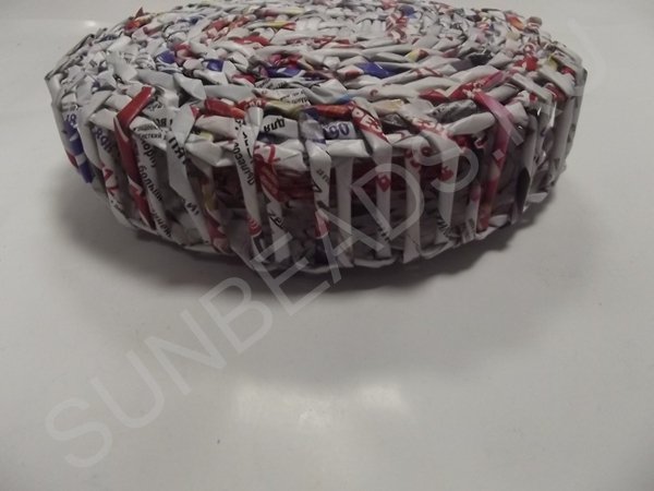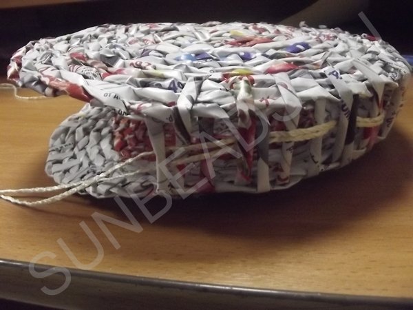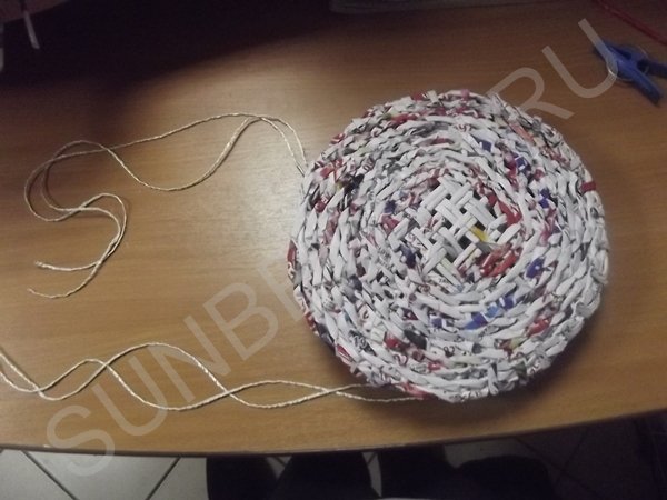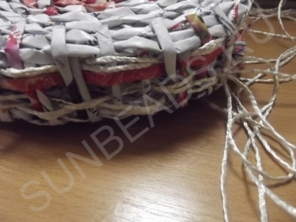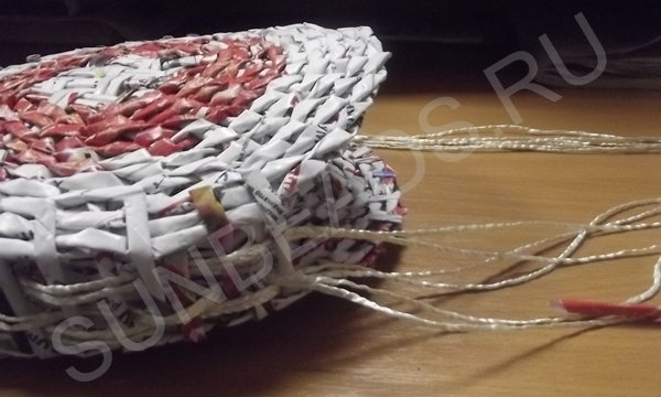 Веревка режется на три одинаковых отрезка, каждый отрезок складывается пополам и продергивается через создавшуюся решетку между кругами. С каждой стороны вытаскиваются примерно одинаковые концы. Теперь создается донышко путем продевания сквозь решетку журнальных трубочек. Все кончики закрепляются мгновенно схватывающим универсальным клеем.