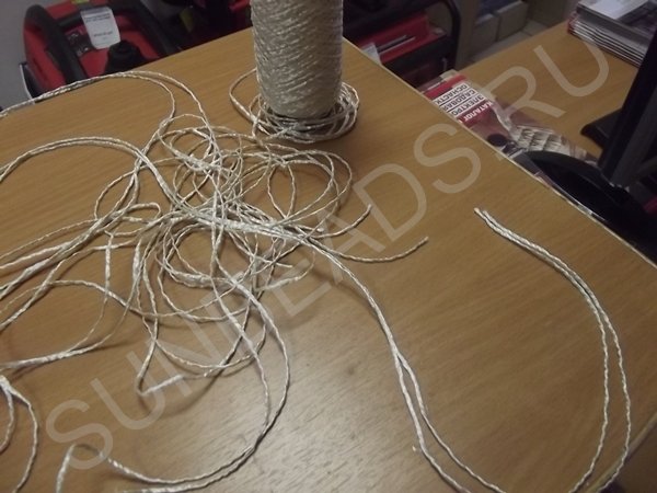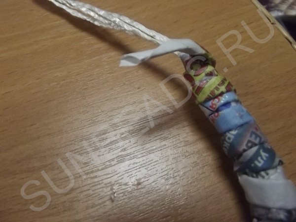 Все концы веревки соединяются, скрепляются мягкой проволокой и заворачиваются мягкими газетными трубочками в три ряда наложением друг на друга.