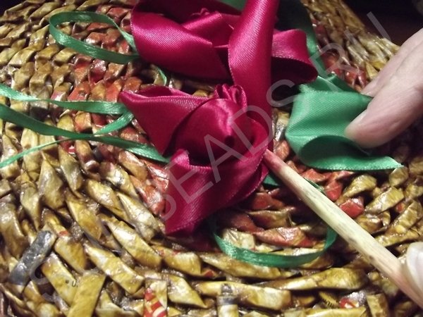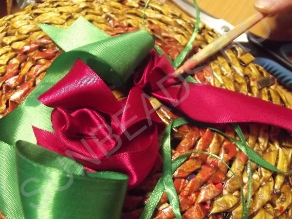 Сначала при помощи универсального клея накладываются зеленые ленты петлями. Затем сворачиваются цветы и приклеиваются в самом центре, остаток ленты также приклеивается петлями вокруг каждого цветка. Пятна клея маскируются лаком для ногтей в виде капель.