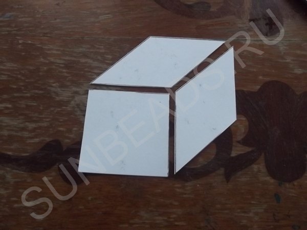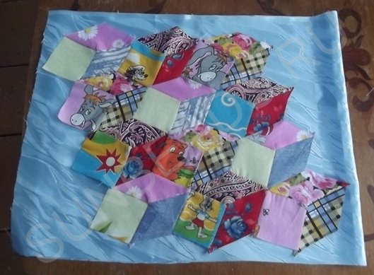 Чтобы создать данный узор из лоскутков, на бумаге чертится правильный куб со сторонами 6 см. Рисунок разрезается по боковым граням на три части. Каждая деталь выкраивается из ткани в следующем количестве: