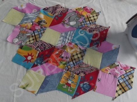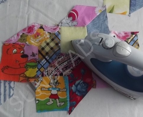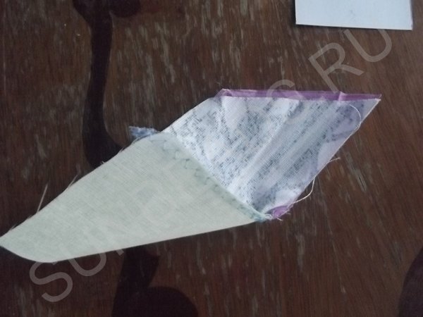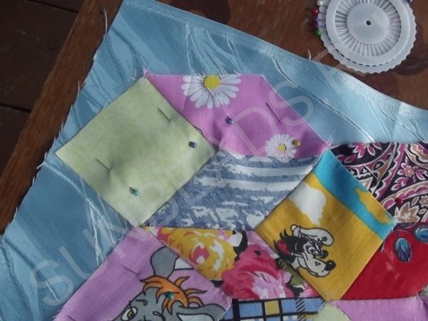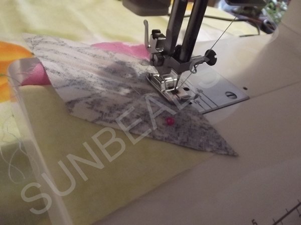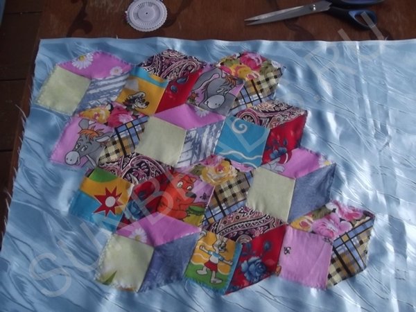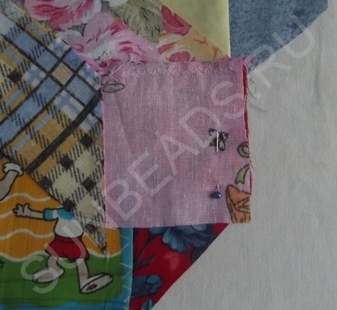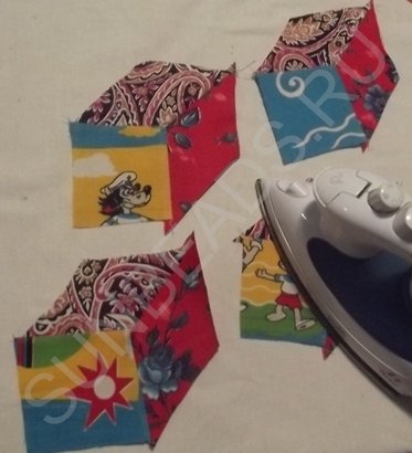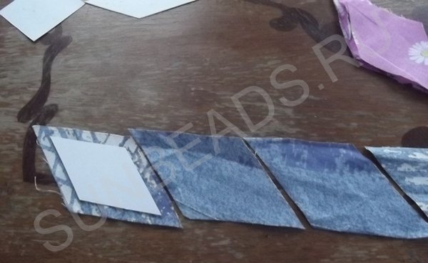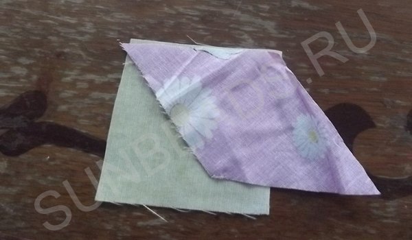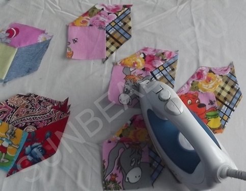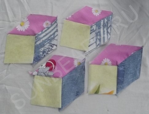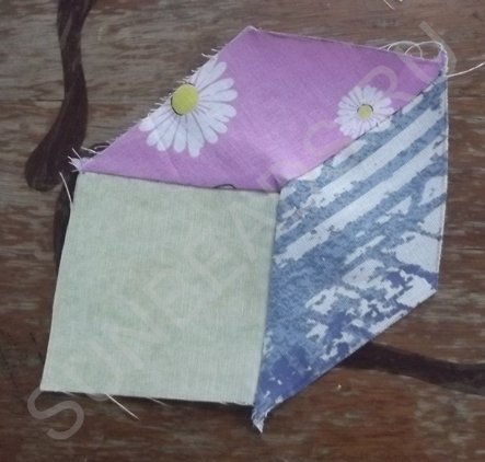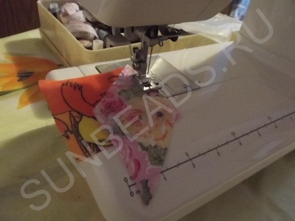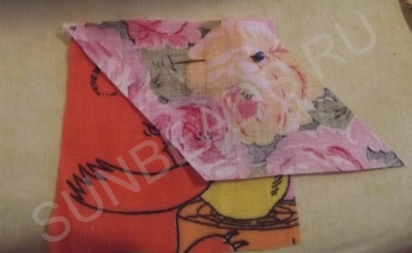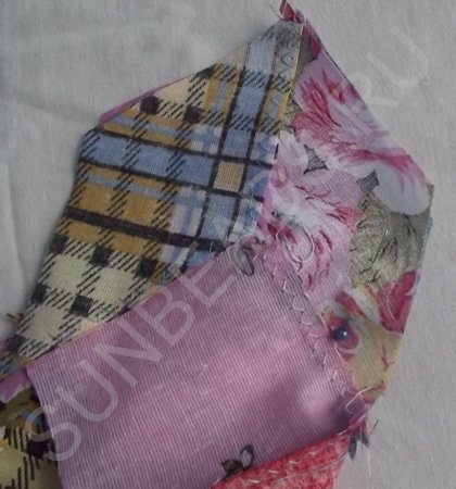 За основу берется желтый квадратик, к верхнему краю которого прикладывается кусочек розовой части и крепится иголочкой. Обе детали кладутся лицом друг к другу. Первое соединение прошивается на машинке швом зигзаг, после чего соединившиеся кусочки гладятся горячим утюгом. Далее к боковой стороне основы крепится ромбик синего цвета, второе соединение также прошивается на машинке. После каждой операции пошива, изделие обязательно разглаживается утюгом. Третьим соединением является сшивание двух граней ромбиков. Подобных трехцветных ромбов выполняется 4 штуки.