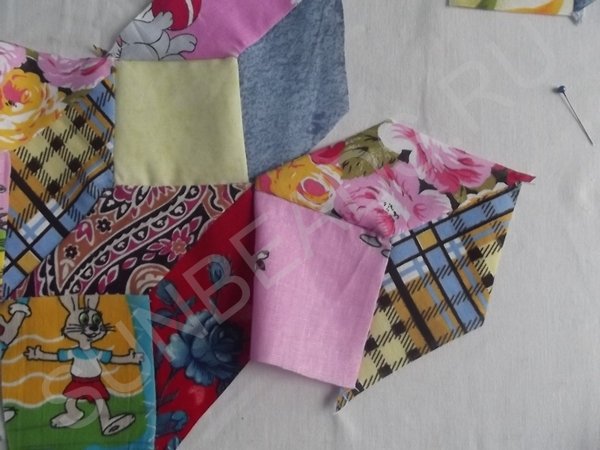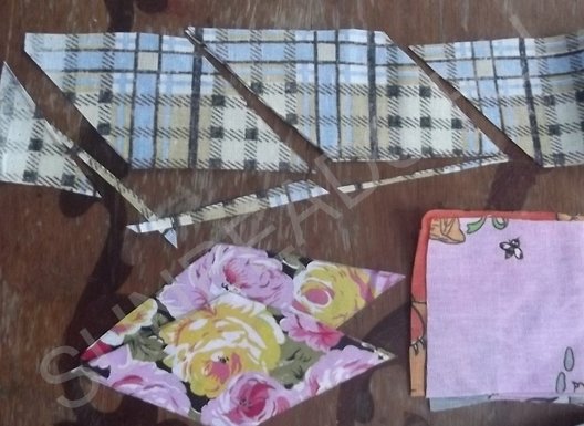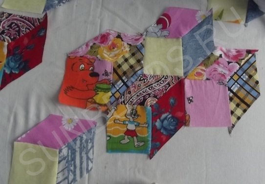 Следующим этапом работы будет раскрой аналогичных деталей из ситца других трех расцветок, их вырезают в том же порядке и количестве. Элементы сшиваются в четыре разноцветных ромба.
