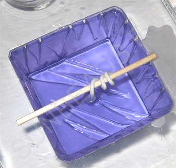 Шаг 1. Подготовим форму для литья. На внутреннюю сторону тонким равномерным слоем нанесем крем, чтобы потом, когда парафин застынет, свечу можно было с легкостью вынуть. Крепим фитиль, как показано на фото. Один его край оставляем в углублении в форме, другой привязываем (или накручиваем на иглу). В данном случае у нас форма для литья без отверстия, вместо этого есть углубление для фитиля это будет верх готовой свечи.