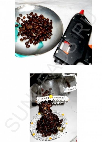 Обматываем скотчем проволоку и плавно переходим на плоскость блюдца. Красим скотч черным маркером, чтобы избежать просветов, когда будут наклеены зерна кофе. С помощью клеевого пистолета фиксируем зернышки полосой вверх. Накладываем их друг на друга имитируя поток. Маскируем таким образом проволоку со всех сторон.