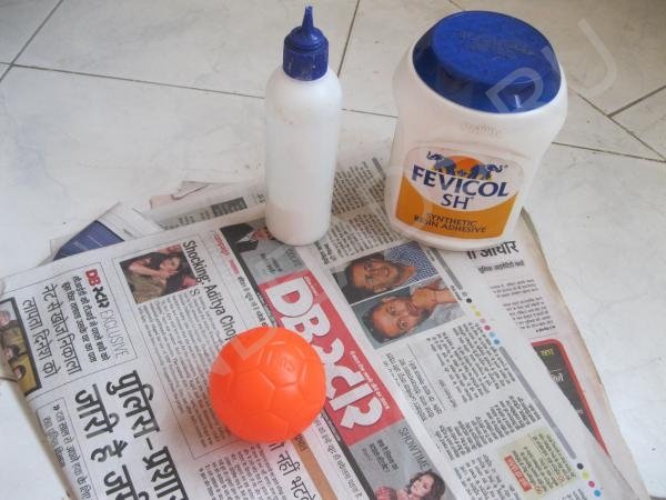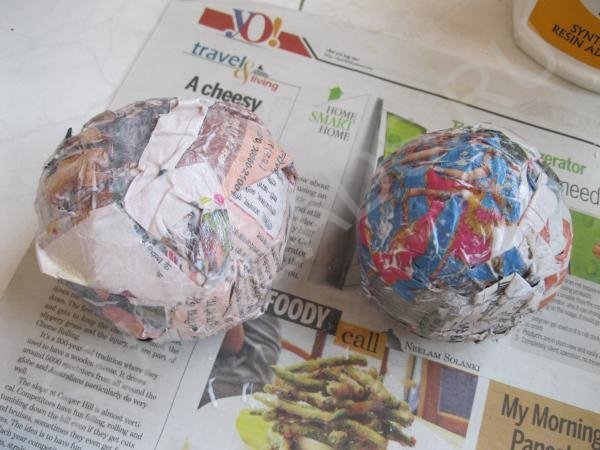 Изначально готовим основу кроны дерева. Для этого обклеиваем мячик газетами и даем высохнуть.