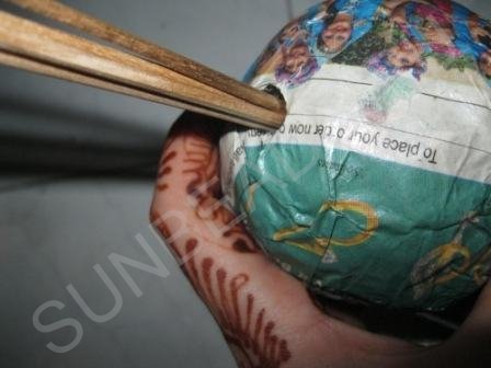 Для этого проделываем небольшое отверстие в шарике (именно поэтому мячики с воздухом не подходят) и вставляем ножку.