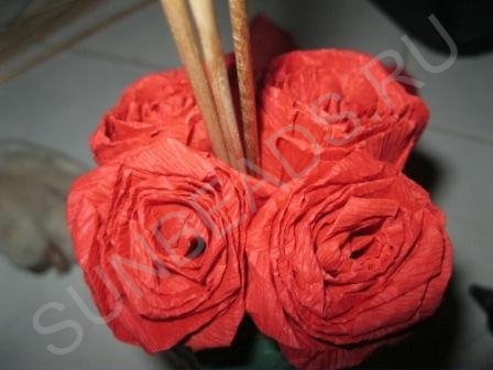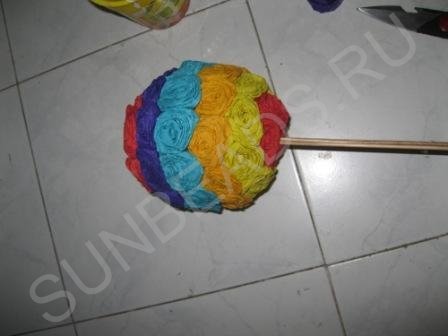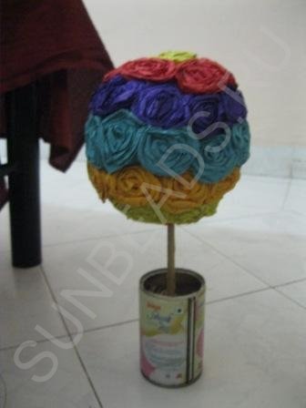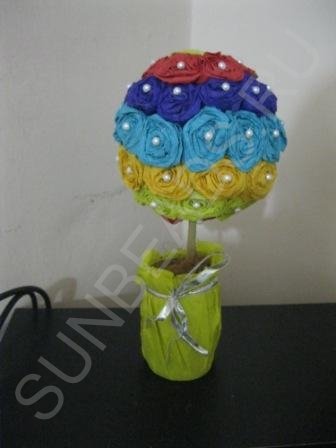 Если вам кажется, что розочек достаточно начинаем клеить их к шару. Если вы используете клей ПВА, то приклеивать можно сразу же как изготовили цветочек: один за другим. Так как времени на сушку требуется гораздо больше. Однако перед тем как присоединять цветочки к «кроне», необходимо создать ствол.