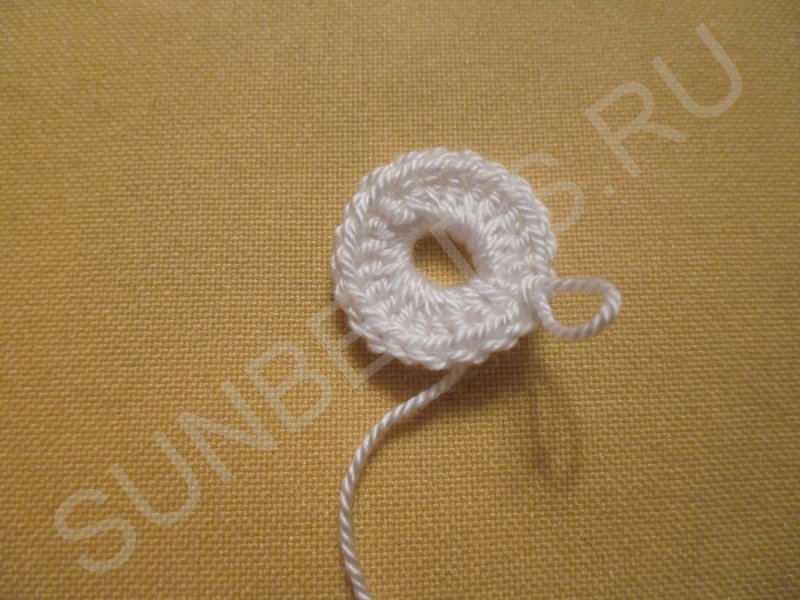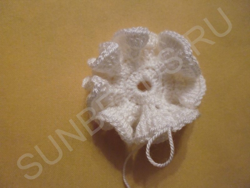Последний ряд вяжем таким образом: в каждый предыдущий столбик провязываем столбик без накида с 3-мя воздушными петлями это «оживит» цветок, добавив ему махровости.