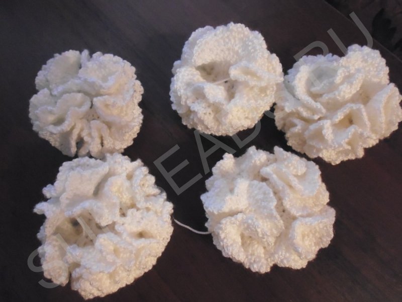 Сначала нам нужно связать 7 гвоздик. Для каждого цветка набираем цепочку из 7 возд. петель, смыкаем их в кольцо, делаем 3 возд. петли подъема, а потом вяжем в кольцо 17 столбиков с накидами.
