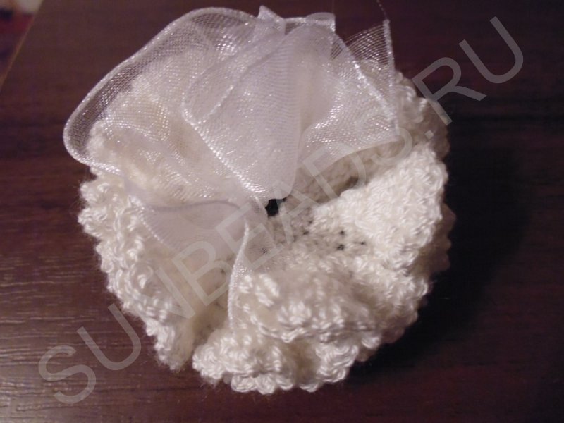 Сгибаем пополам полученную сборку и пришиваем в серединке цветка, не зашивая отверстие в вязаной детали. Работу производим белыми нитками.