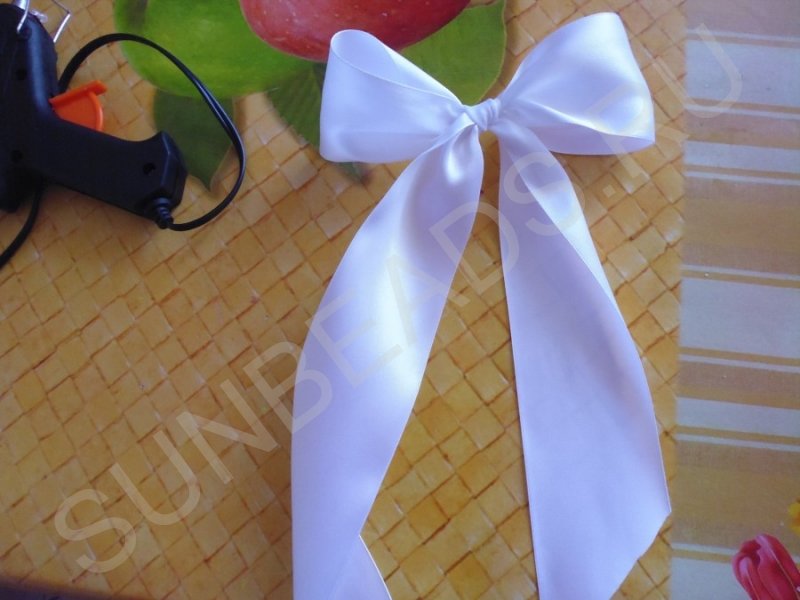 Из той же ленты завязываем бант с длинными концами, срезанными под углом. Срезы ленты обязательно опаливаем, чтобы не сыпались.