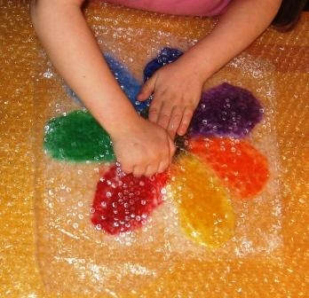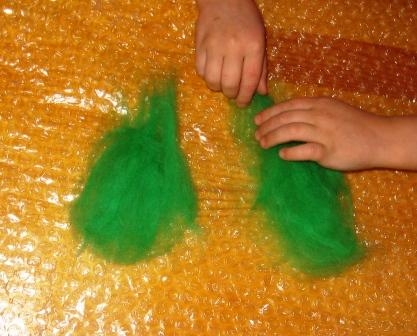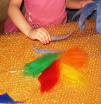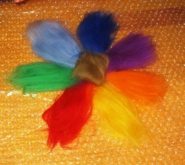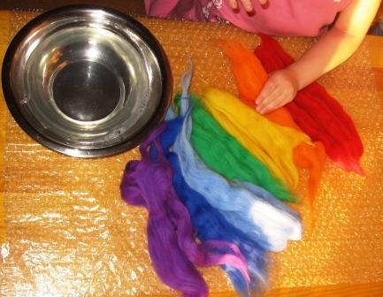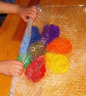 Для творения нам понадобится шерсть для валяния нескольких оттенков (мы будем валять Цветик-Семицветик), теплый мыльный раствор столовая ложка тертого детского мыла (или жидкости для мытья посуды) на 1 л воды (t для ребенка может быть 40-50°, для взрослого 60-70°, или как руки терпят), пупырчатая пленка обычной она идет в качестве оберточного защитного слоя при покупке хрупких вещей, если такой пленки нет можно использовать и обычную клеенку, чтобы защитить рабочую поверхность от воды. Пленка обеспечивает дополнительный массаж шерсти, что ускоряет процесс валяния.