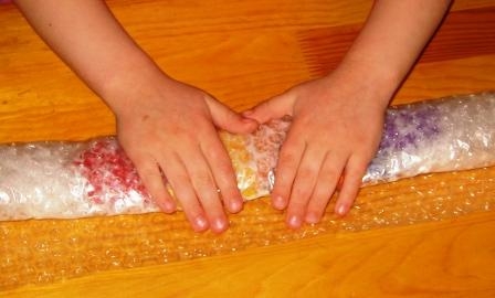 Совет: при валянии по выкройке или когда нам важен размер готового изделия, необходимо валять от краев к центру, чтобы заготовка не потеряла форму. При валянии изделий для которых размер не так важен, например, цветка можно валять от центра к краям. - Проверить схватилась ли у вас шерсть или еще нет можно попробовав отщипнуть волокна шерсти от заготовки если они не отделяются целиком, значит ваш цветочек почти уже свалян. Можно переходить к другому способу валяния, который позволит ускорить процесс валки. Положим нашу шерстяную заготовку сверху на кусочек пупырчатой пленки и свернем поплотнее трубочкой.