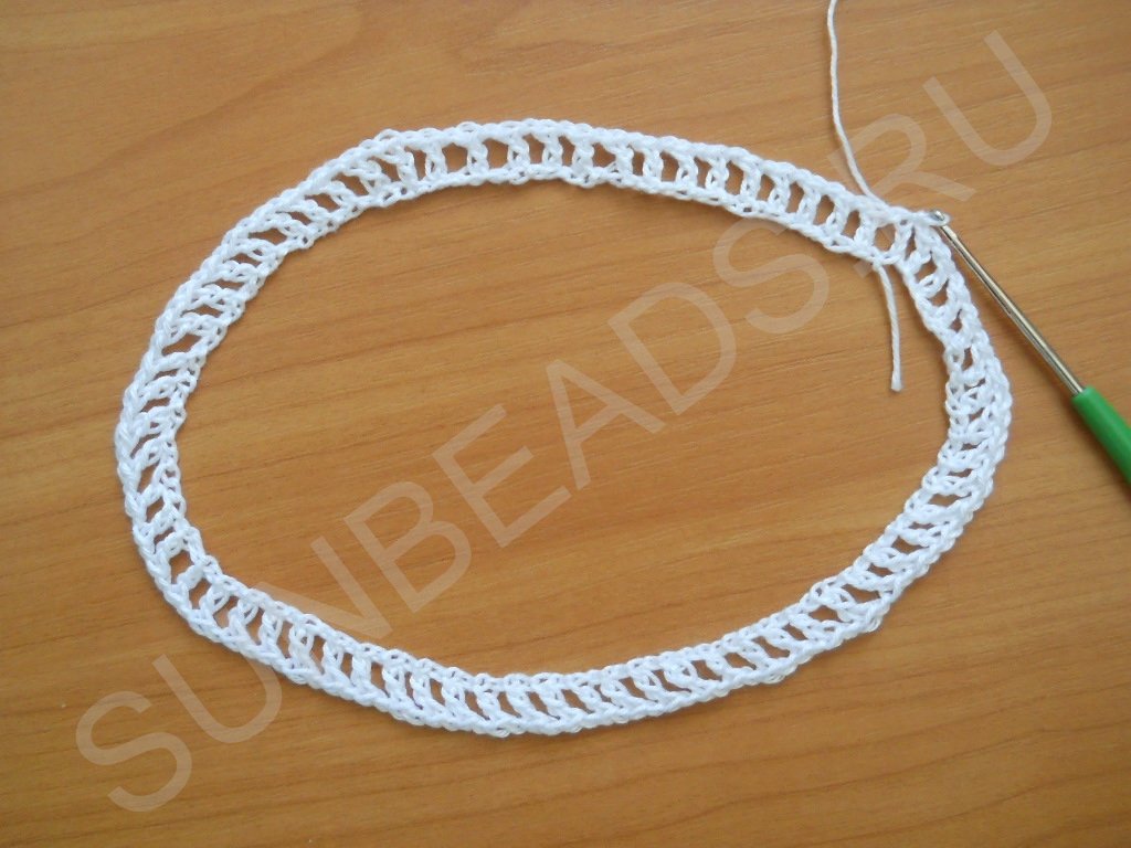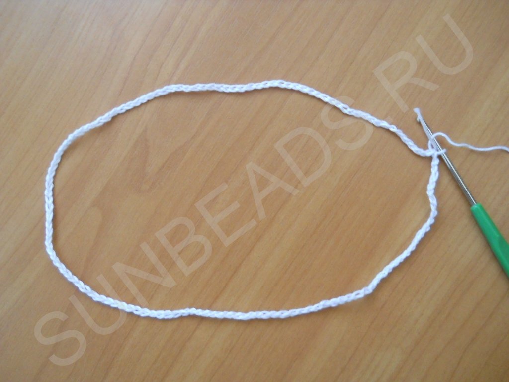 - Наберите цепочку из 130 воздушных петелек. Замкните ее соединительным столбцом в кольцо.