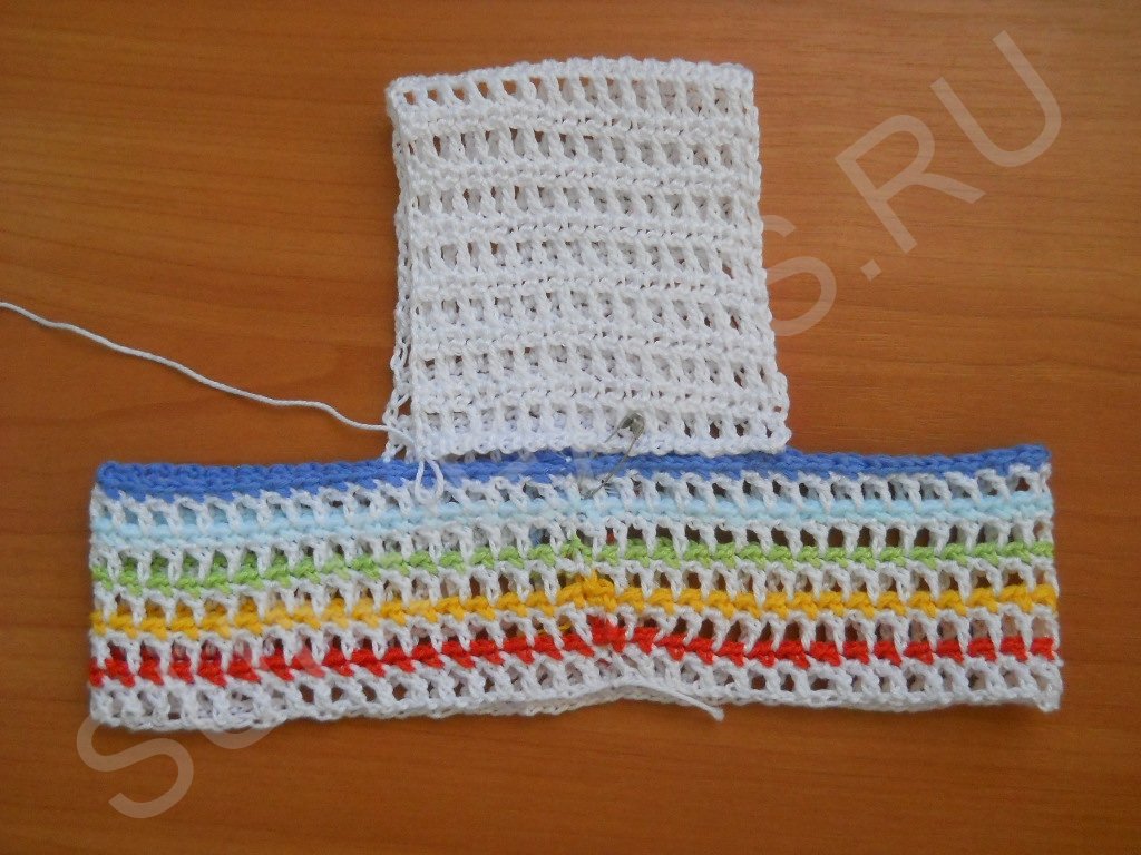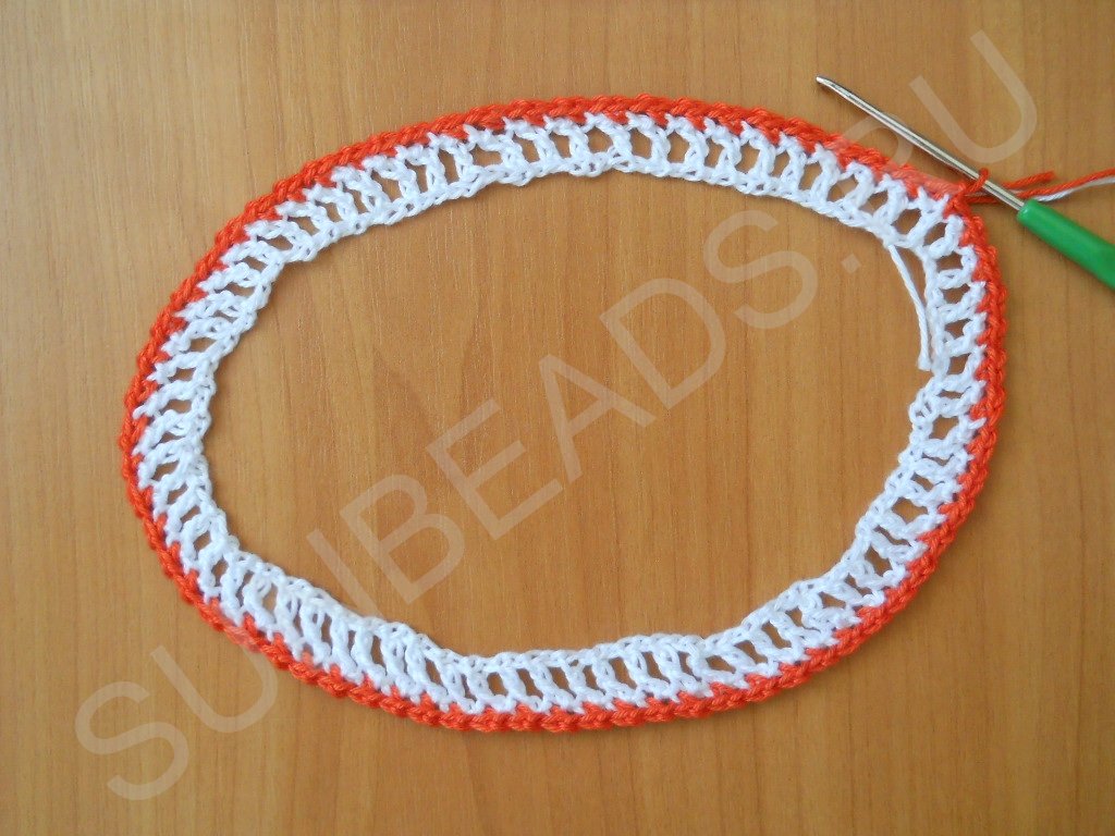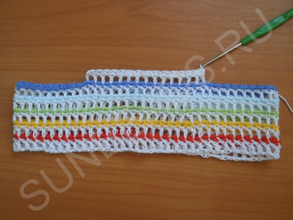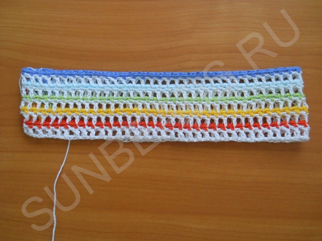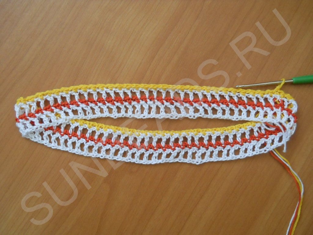 - Столбцами без накида присоедините конец полосы к задней части изделия. Нить отрежьте и закрепите.