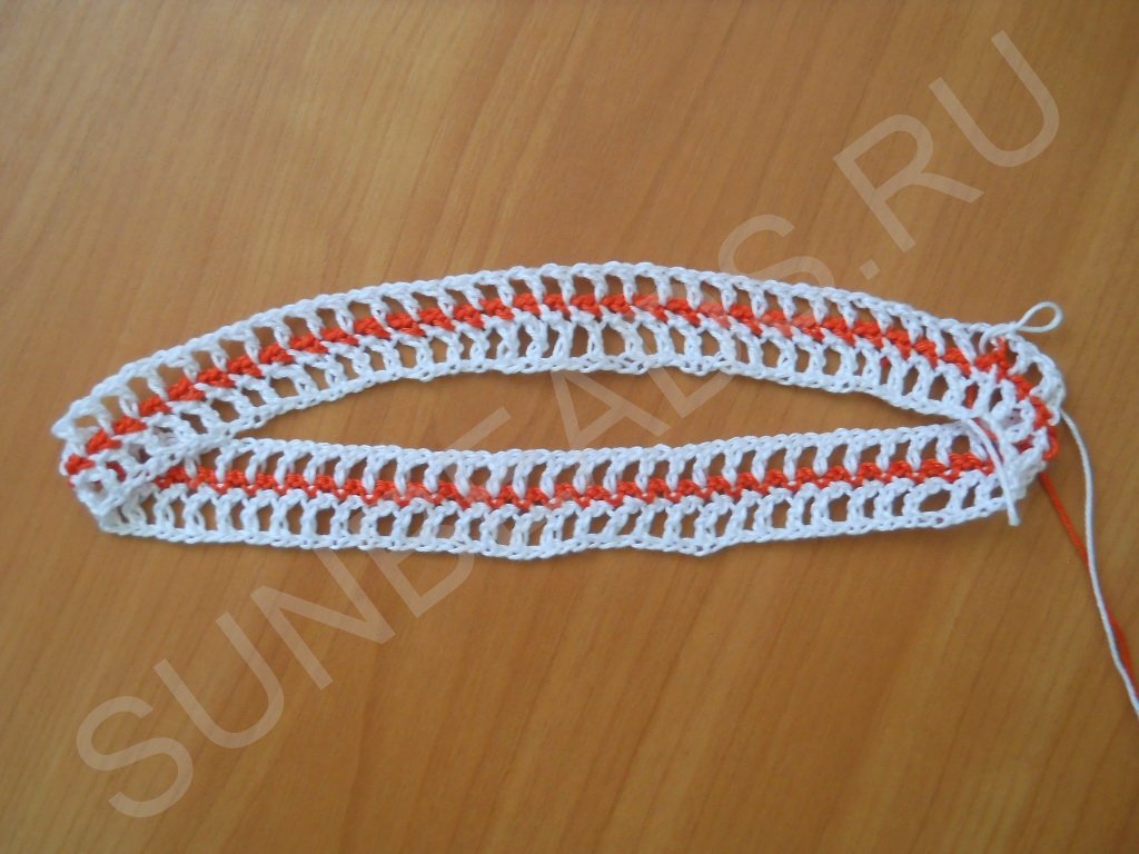 - Третий ряд выполняйте белой нитью по тому же описанию, что и первый. После того, как провязана последняя петля, присоедините нитку другого цвета.
