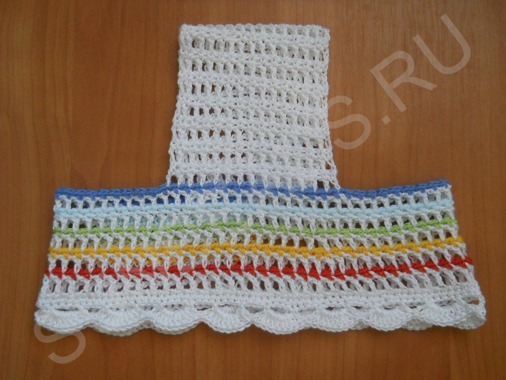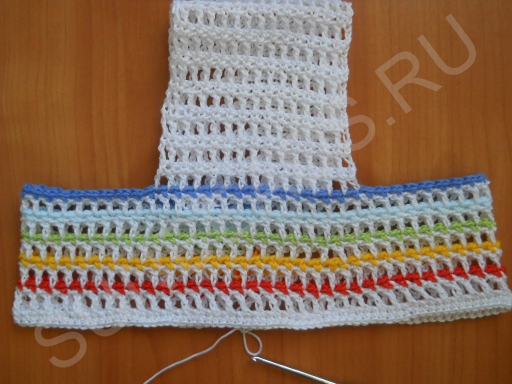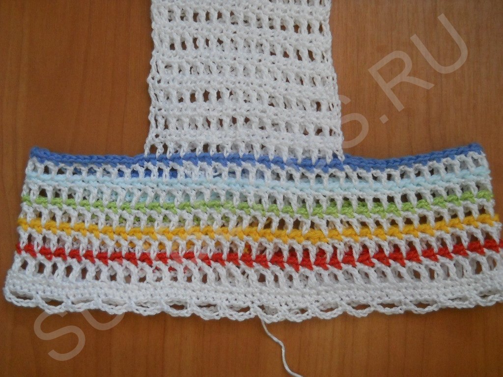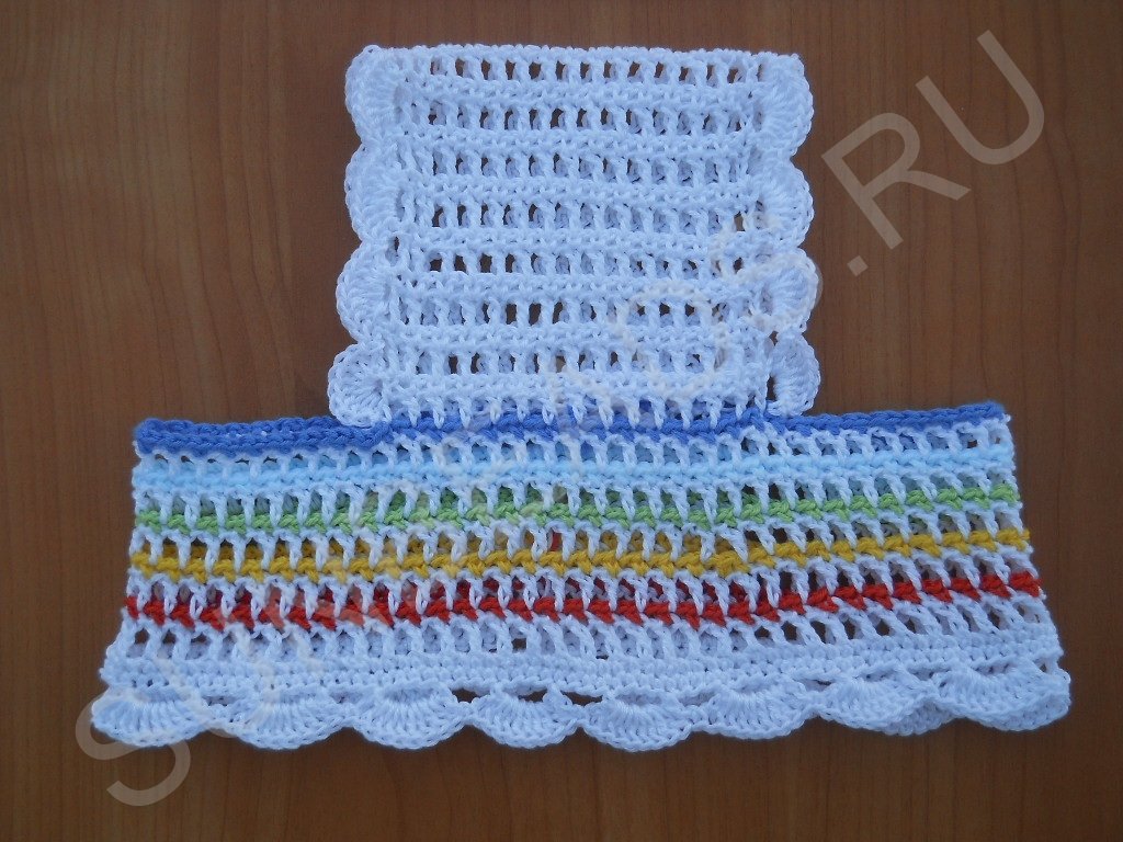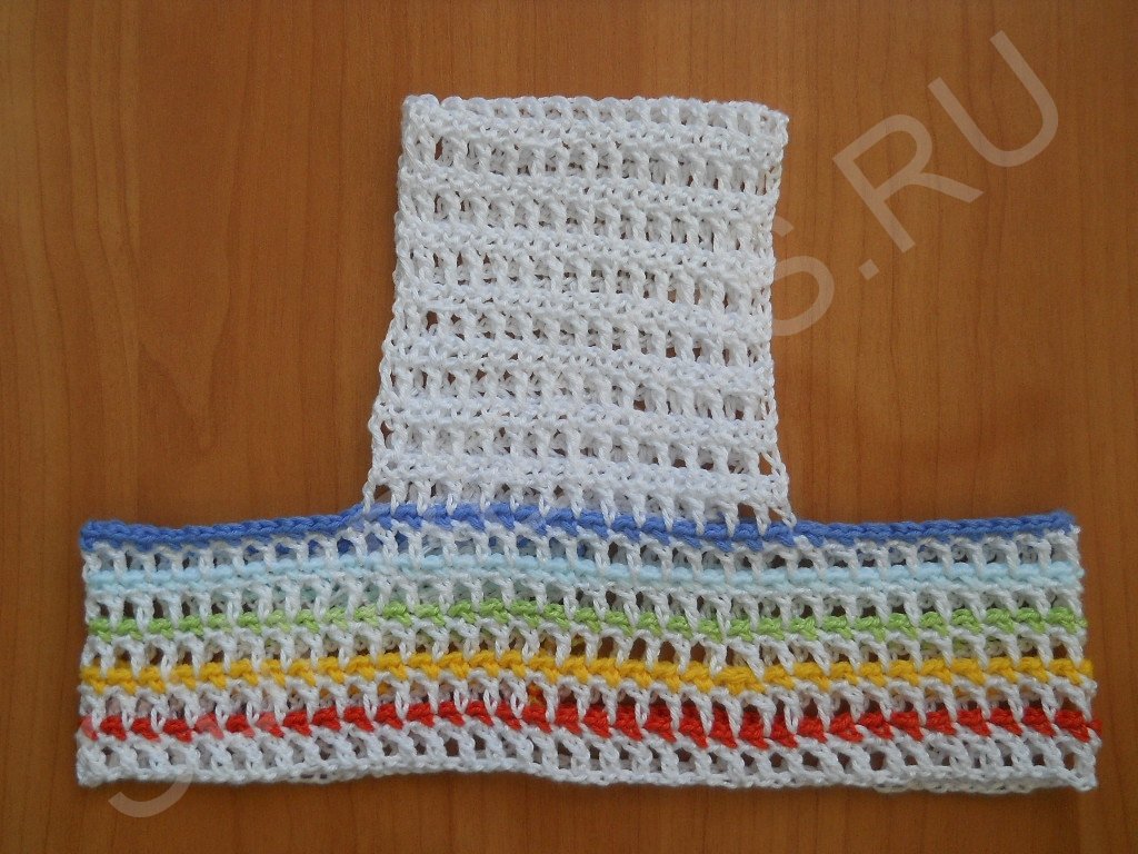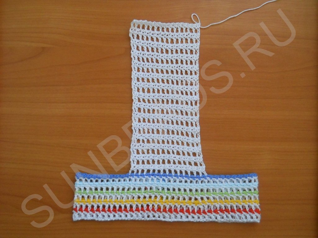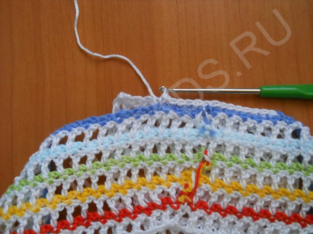 - Прикрепите нить к нижнему краю изделия и провяжите 2 ряда столбиками без накида.