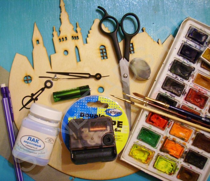 - Раскрасьте часы акварельными красками, стараясь не сделать изображение чрезмерно ярким. Дайте рисунку полностью высохнуть;