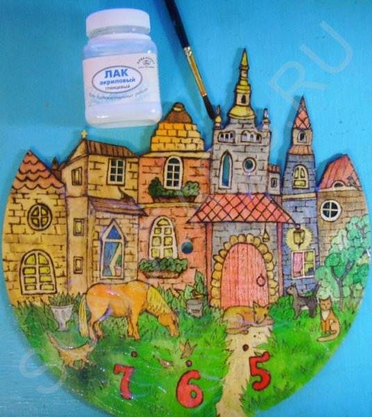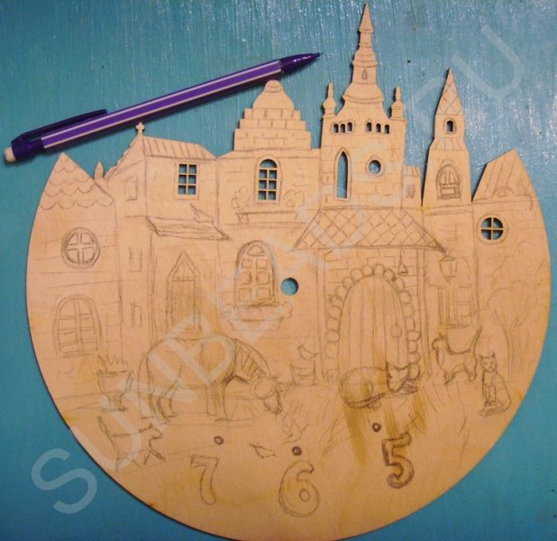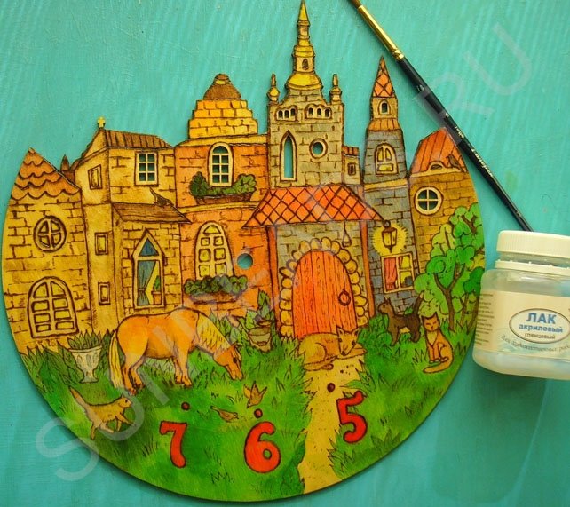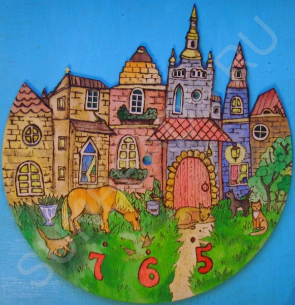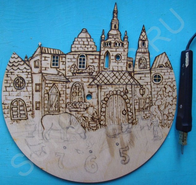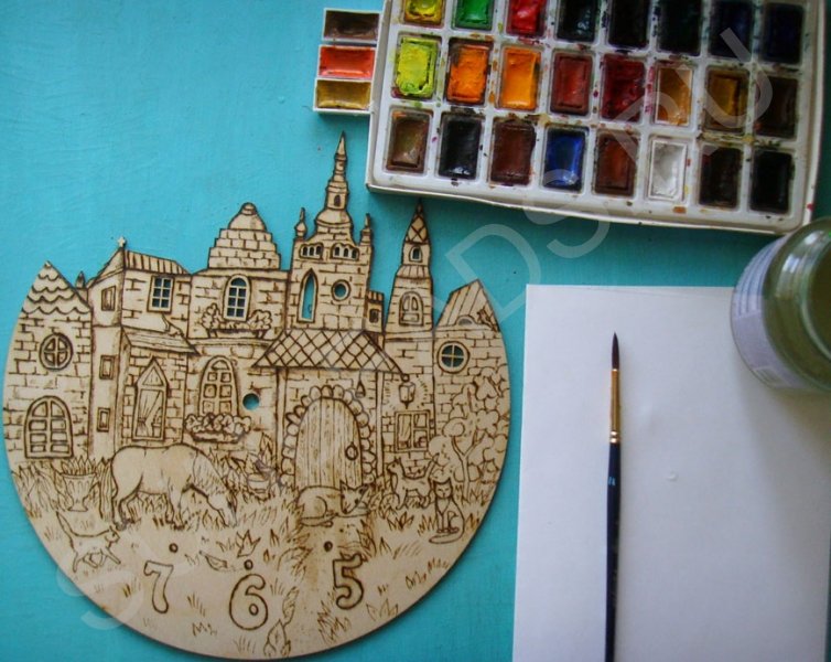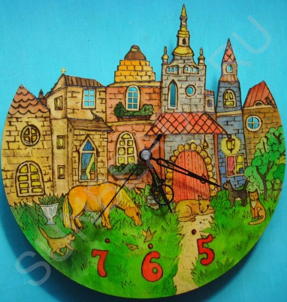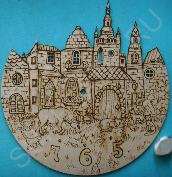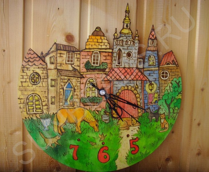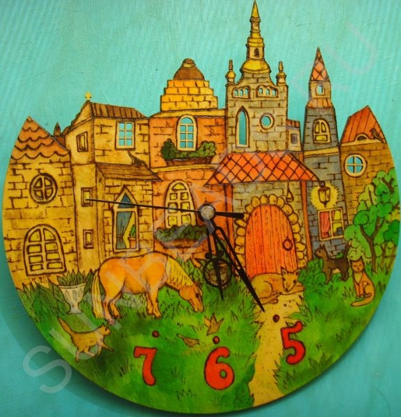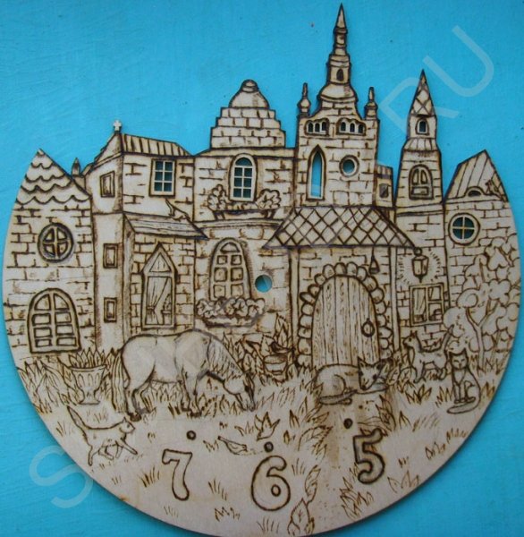 Настенные часы «Сказочный город» — выжигание по дереву#