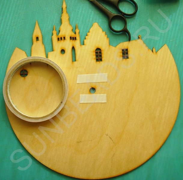 Часы «Сказочный город» полностью готовы. Теперь их можно повесить на стену, воспользовавшись для этого двусторонним скотчем. Хорошо они будут смотреться и на полочке, если она расположена не слишком высоко.