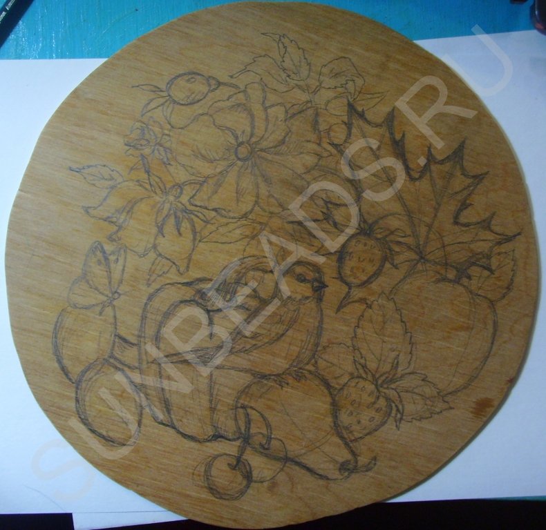 - Включите прибор для выжигания и дождитесь, пока его наконечник не нагреется до максимальной температуры. Аккуратно выжгите контуры рисунка;