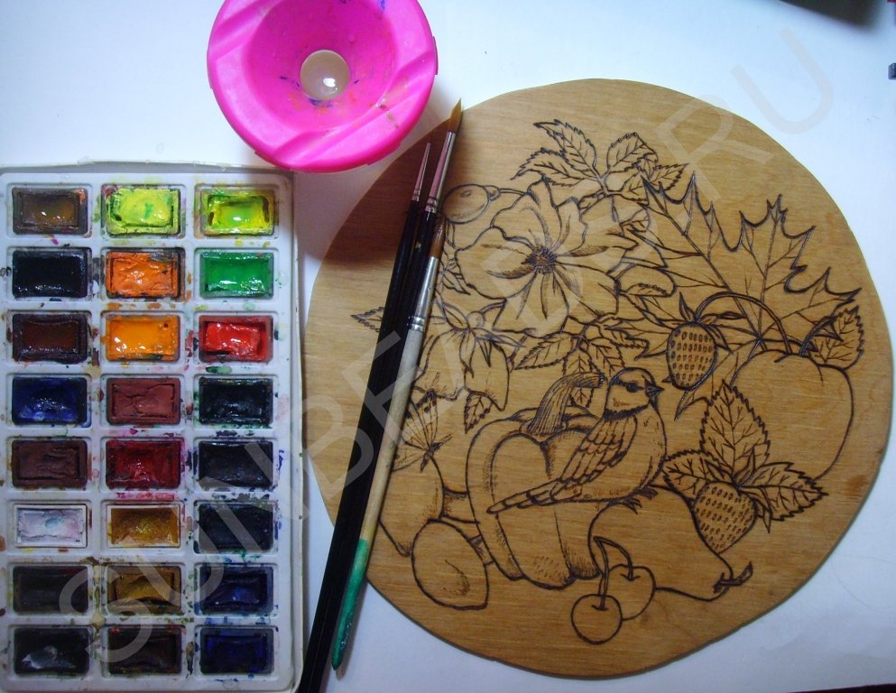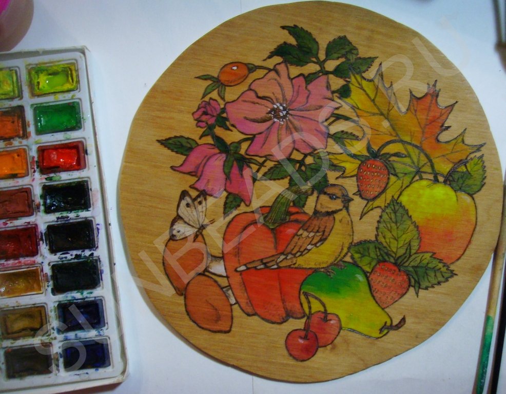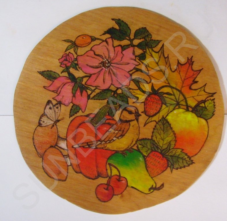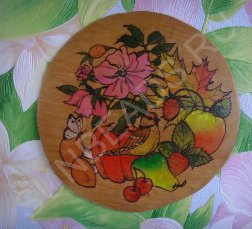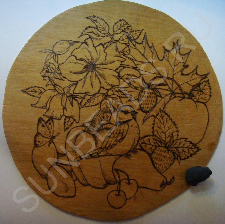 С помощью прибора для выжигания можно создать уникальное украшение для своей кухни. А еще это яркое изделие ручной работы сможет стать великолепным подарком к любому празднику. Такая картина с цветами и фруктами будет очень долго радовать своих владельцев, ведь она не утратит свой первоначальный внешний вид из-за воздействия влаги или же солнечного света.