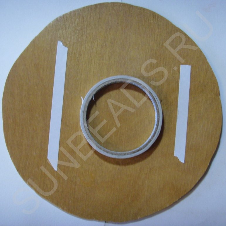 - Переверните фанеру и наклейте на ее обратную сторону две длинных полоски двустороннего скотча;