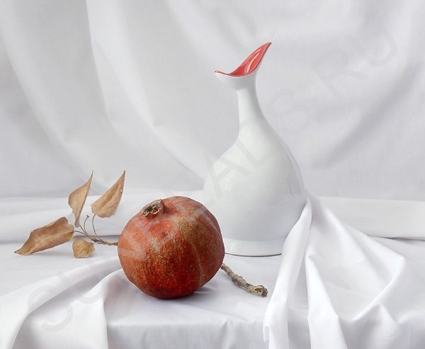 На фотографии мы видим деликатное сочетание сложного красного цвета граната, сухой ветки и горлышка кувшинчика с белой драпировкой и белым кувшином.