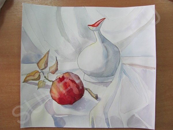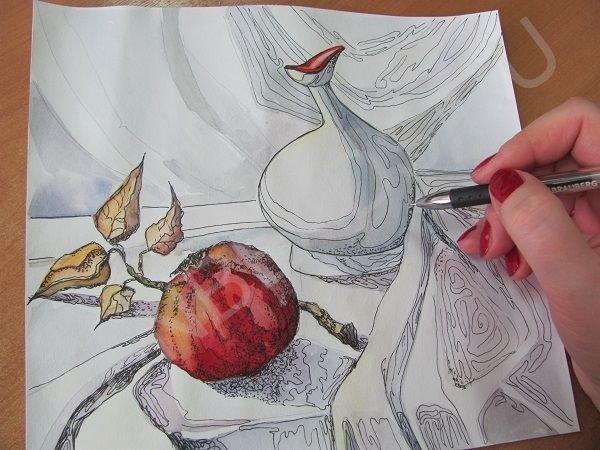 Рисуем драпировку, тень и свет на кувшине. Помним, что в свету предметы теплее, в тени холоднее. Там, где свет, берем на кисть капельку охры, там где тени, используйте синий и фиолетовый. На кисти должно быть много воды, мало краски, тогда вы сможете получить бледные прозрачные оттенки.