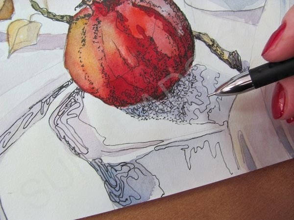 Далее работаем черной гелевой ручкой. Маленькими штрихами, точками, кривыми линиями, повторяющими форму предметов, добавляем детали.