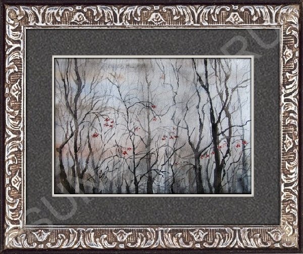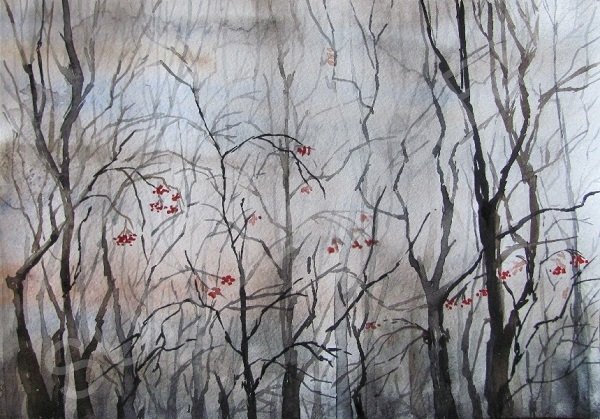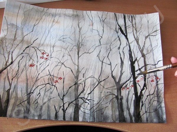 Если есть желание, для небольшого контраста можно добавить ягодки рябины на ветках. Это подчеркнёт общую цветовую гамму рисунка, создаст необходимый цветовой акцент.
