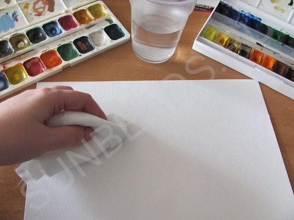 Смачиваем лист влажной салфеткой. Нам нужен сложный живописный фон, он создаст необходимое настроение.