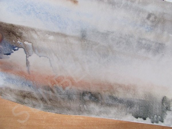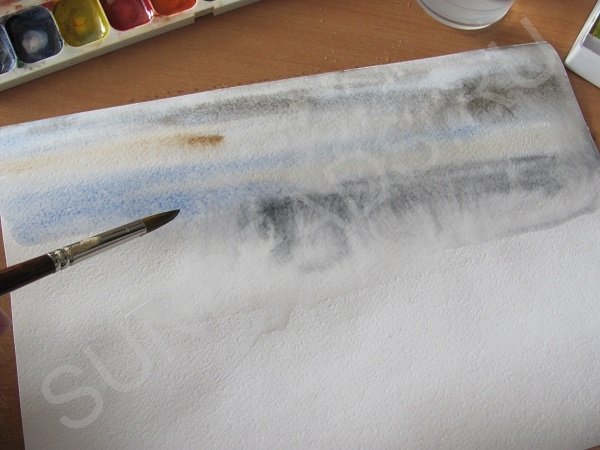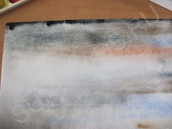 Верхний край листа делаем темнее, добавляя темного тона черной краской. Если лист подсыхает, увлажняем его мокрой кистью. Потом это будет низ рисунка.