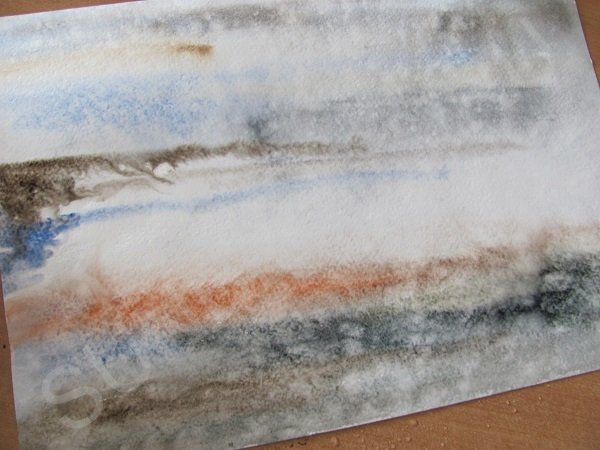 Брызгаем водой на еще влажный лист бумаги, чтобы появились живописные пятнышки. Оставляем сохнуть.