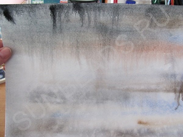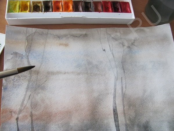 После того, как бумага немного подсохла, переворачиваем ее темным краем вниз. Бледными линиями начинаем произвольно рисовать деревья, помня о том, что стволы внизу толще и мощнее, чем вверху. За образец можете взять фото из сети интернет. А если посмотреть в окошко, там тоже можно найти подходящий сюжет. Самым лучшим вариантом было бы прогуляться в пасмурную погоду по лесу или парку, чтобы набраться нужных впечатлений.
