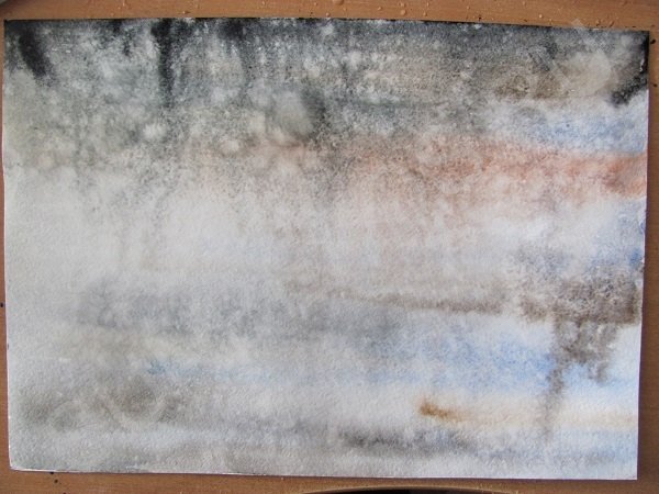 Набираем кистью поочередно черную, синюю, коричневую краски и распускаем по сырому листу, наблюдая, как на наших глазах образовываются новые оттенки. Яркие, сочные краски не понадобятся, потому что мы стараемся уловить и передать атмосферу пасмурного леса, а это немного серые, дымчатые, бледно-коричневые оттенки, кое-где проглядывает холодное бледно-голубое небо.